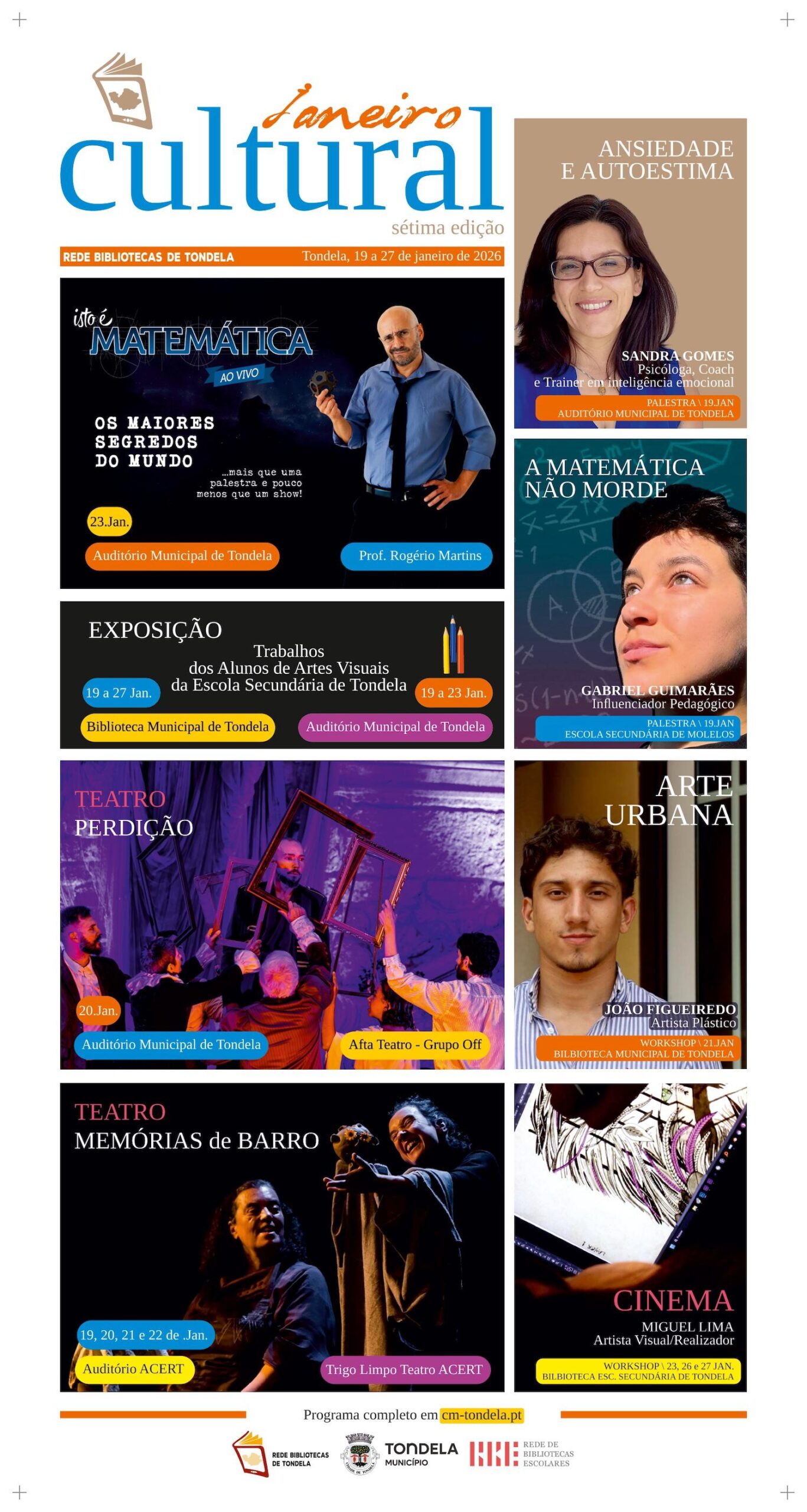 A cidade de Tondela prepara-se para acolher, entre os dias 19 e 27 de janeiro de 2026, a sétima edição do Janeiro Cultural. Esta iniciativa, que nasce de uma estreita colaboração entre a Rede de Bibliotecas de Tondela e o Município de Tondela, com o apoio da Rede de Bibliotecas Escolares, através da coordenadora interconcelhia Helena Duque, afirma-se como um espaço de diálogo, reflexão e crescimento, desenhado especialmente para envolver os alunos do 9.º ano e de todo o ensino secundário, abrangendo tanto os cursos científico-humanísticos como as vias profissionais.
