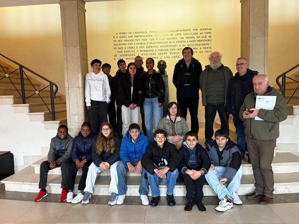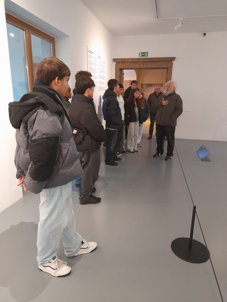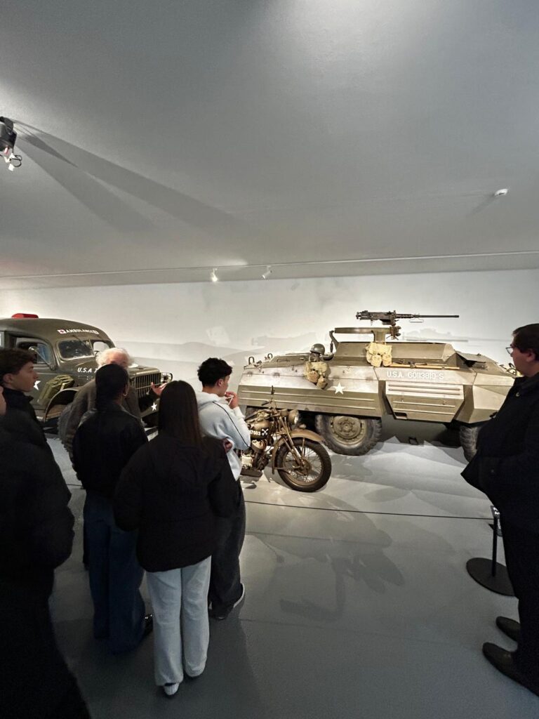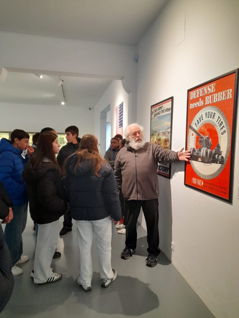 Os alunos do 9.º ano e o Professor Jaime Carvalho e Silva foram surpreendidos, após o almoço, com uma visita relâmpago ao Museu do Caramulo, organizada em articulação com a Biblioteca da Escola. Tiveram a oportunidade de explorar a exposição atual, “A Segunda Guerra Mundial ao Vivo e a Cores”, aprofundando ainda mais os conhecimentos abordados durante a palestra da manhã. O verdadeiro momento especial surgiu quando o Professor Jaime Carvalho e Silva, com a sua generosidade habitual, guiou pessoalmente o grupo pela exposição. A sua explicação minuciosa, a forma apaixonada como descreveu cada detalhe e a clareza das suas interpretações transformaram a visita numa experiência inesquecível.